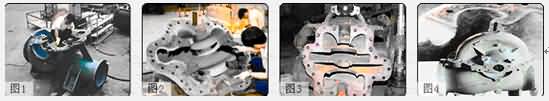 圖1: 渣漿泵泵腔在高速液體中的砂粒的沖刷作用下,磨損嚴重,圖為打磨泵體磨損面后,用RJ系列特種耐磨材料進行修復。