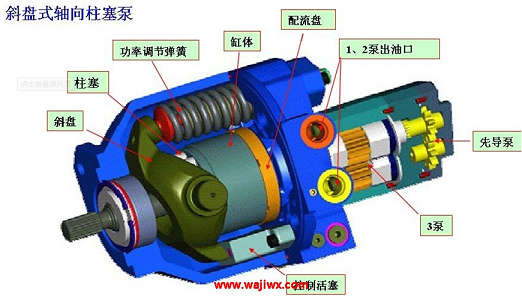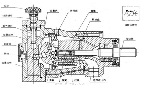 柱塞泵是往復泵的一種,屬于體積泵,其柱塞靠泵軸的偏心轉動驅動,往復運動,其吸入和排出閥都是單向閥。當柱塞外拉時,工作室內壓力降低,出口閥關閉,低于進口壓力時,進口閥打開,液體進入;柱塞內推時,工作室壓力升高,進口閥關閉,高于出口壓力時,出口閥打開,液體排出。當傳動軸帶動缸體旋轉時,斜盤將柱塞從缸體中拉出或推回,完成吸排油過程。柱塞與缸孔組成的工作容腔中的油液通過配油盤分別與泵的吸、排油腔相通。變量機構用來改變斜盤的傾角,通過調節斜盤的傾角可改變泵的排量。