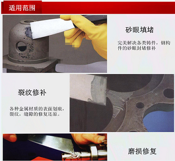 適用于鋼鐵零件磨損修補及劃傷、裂紋等損傷修復。機械強度高;抗磨損,耐酸堿腐蝕;能與金屬完美結合。